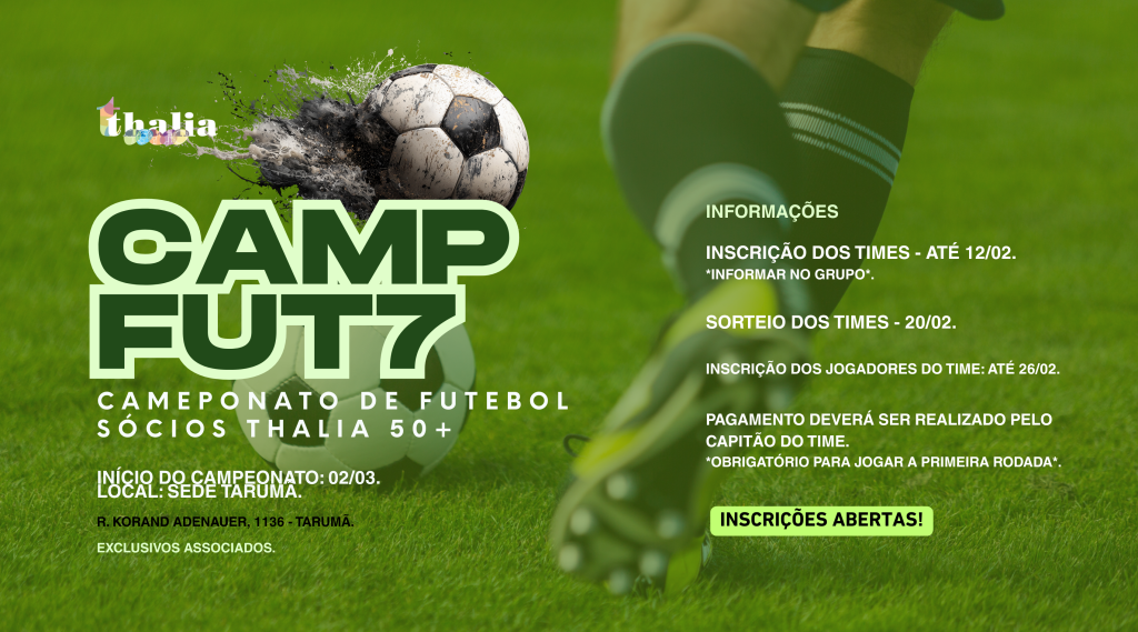 ⚽ Vem aí o CAMP FUT7 – Campeonato de Futebol dos Sócios Thalia 50+ ⚽ A bola vai rolar para mais uma edição do nosso campeonato exclusivo para associados! Um evento que une esporte, integração e muita paixão pelo futebol. 📍 Local: Sede Tarumã📅 Início do campeonato: 02/03📌 Endereço: Rua Konrad Adenauer, 1136 – Tarumã […]