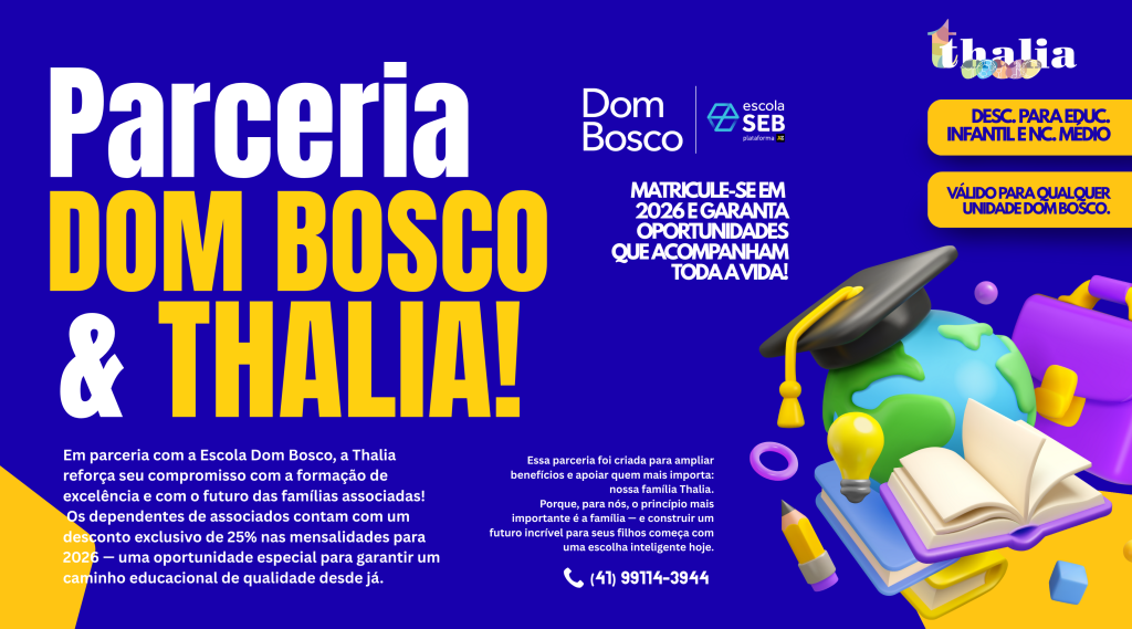 🎓✨ Parceria Dom Bosco & Thalia! ✨🎓A Thalia segue fortalecendo seu compromisso com a educação de excelência e com o futuro das nossas famílias associadas! Em parceria com a Escola Dom Bosco, os dependentes de associados contam com 25% de desconto nas mensalidades para 2026. Uma oportunidade única para garantir um caminho educacional de qualidade […]
