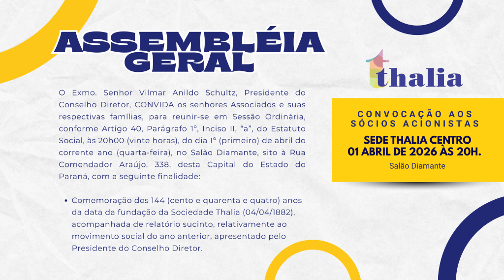 ✨🥂 144 anos de história merecem uma celebração inesquecível! A Sociedade Thalia convida você para viver uma noite especial, elegante e cheia de significado na comemoração dos 144 anos do nosso clube. Um momento único para celebrar nossa história, fortalecer amizades e brindar tudo o que construímos juntos ao longo das gerações. 📅 11 de […]